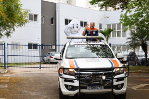O Zé Gotinha pegou carona com as equipes da Defesa Civil | Foto: Cláudio Vieira/PMSJC.