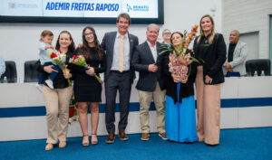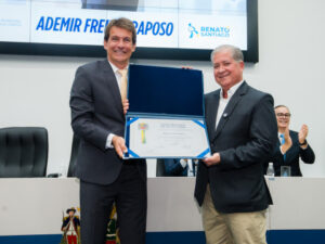 A Câmara entregou o título de Cidadão Joseense ao gestor Ademir Freitas Raposo, nesta segunda-feira (5), em sessão solene. A honraria foi concedida pelo decreto legislativo 5/2025, do vereador Renato Santiago (União). Além do autor do projeto, também estiveram presentes o parlamentar Fabião Zagueiro (PSD) e o presidente da Urbam, Ricardo Minoru Iida.