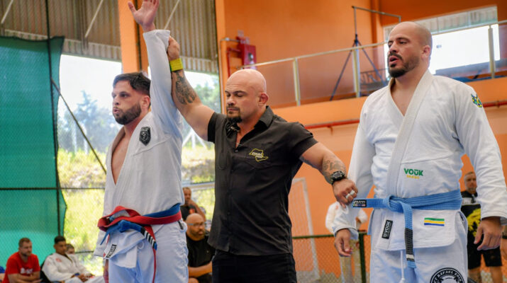 GCMs de São José vencem torneio de jiu-jitsu em Guará O juiz ergue a mão do GCM Vítor Camacho após vitória no