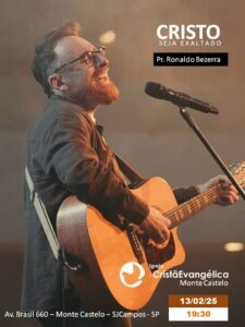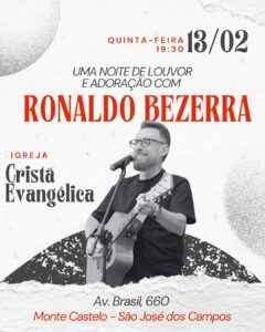 No dia 13 de fevereiro de 2025, às 19:30, Ronaldo Bezerra estará na cidade de São José dos Campos, ministrando a Palavra de Deus e seus louvores que fazem parte do seu repertório, entre elas, “Tu és Santo”, “Eu te louvarei”, “E eu Canto”, “Eu te bendirei, entre outras.