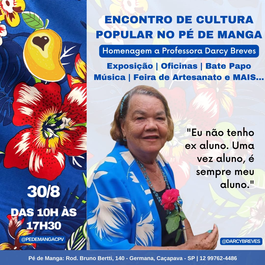 O Pé de Manga – Cultura e Afeto realiza no dia 30 de agosto, das 10h às 17h30, seu primeiro Encontro de Cultura Popular, com uma programação inédita que reúne bate-papo com música, exposição, oficinas, feira de artesanato e uma homenagem especial à professora, escritora e folclorista Darcy Breves.