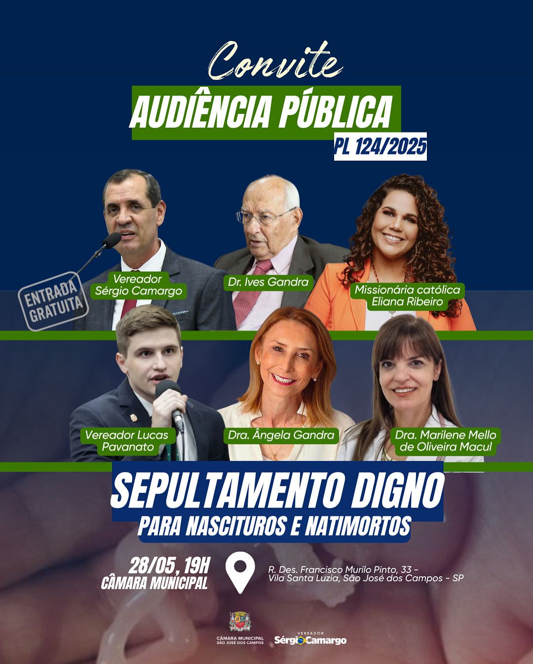 A cidade de São José dos Campos será palco de um importante evento pró-vida no dia 28 de maio, às 19h, na Câmara Municipal, reunindo autoridades, juristas, representantes religiosos e a sociedade civil em torno do debate sobre o Projeto de Lei 124/2025, que assegura o direito ao sepultamento para nascituros e natimortos, independentemente da idade gestacional.