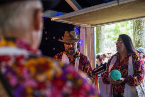 Soynaara (à direita na foto), Contramestre da Folia de Reis do Mestre Zé Mira participa de manifestação no Museu do Folclore – Foto: Divulgação.