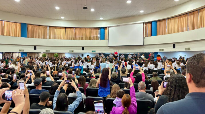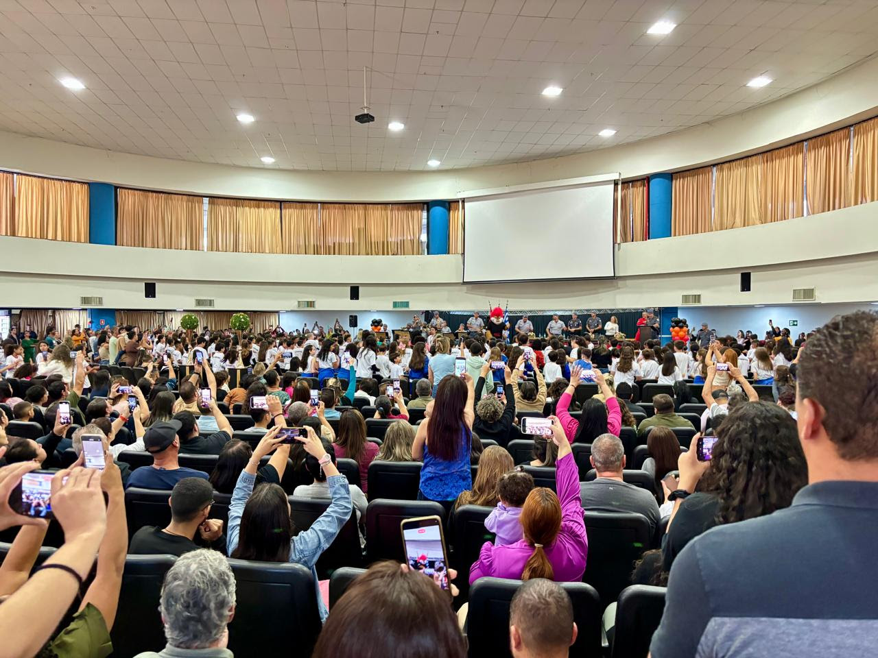 Outro momento marcante foi a apresentação da tradicional música do Proerd, cantada em coro pelos alunos, que entoaram os versos com entusiasmo e orgulho. O canto coletivo emocionou pais e professores, que acompanharam de pé, muitos deles registrando o momento com fotos e vídeos.