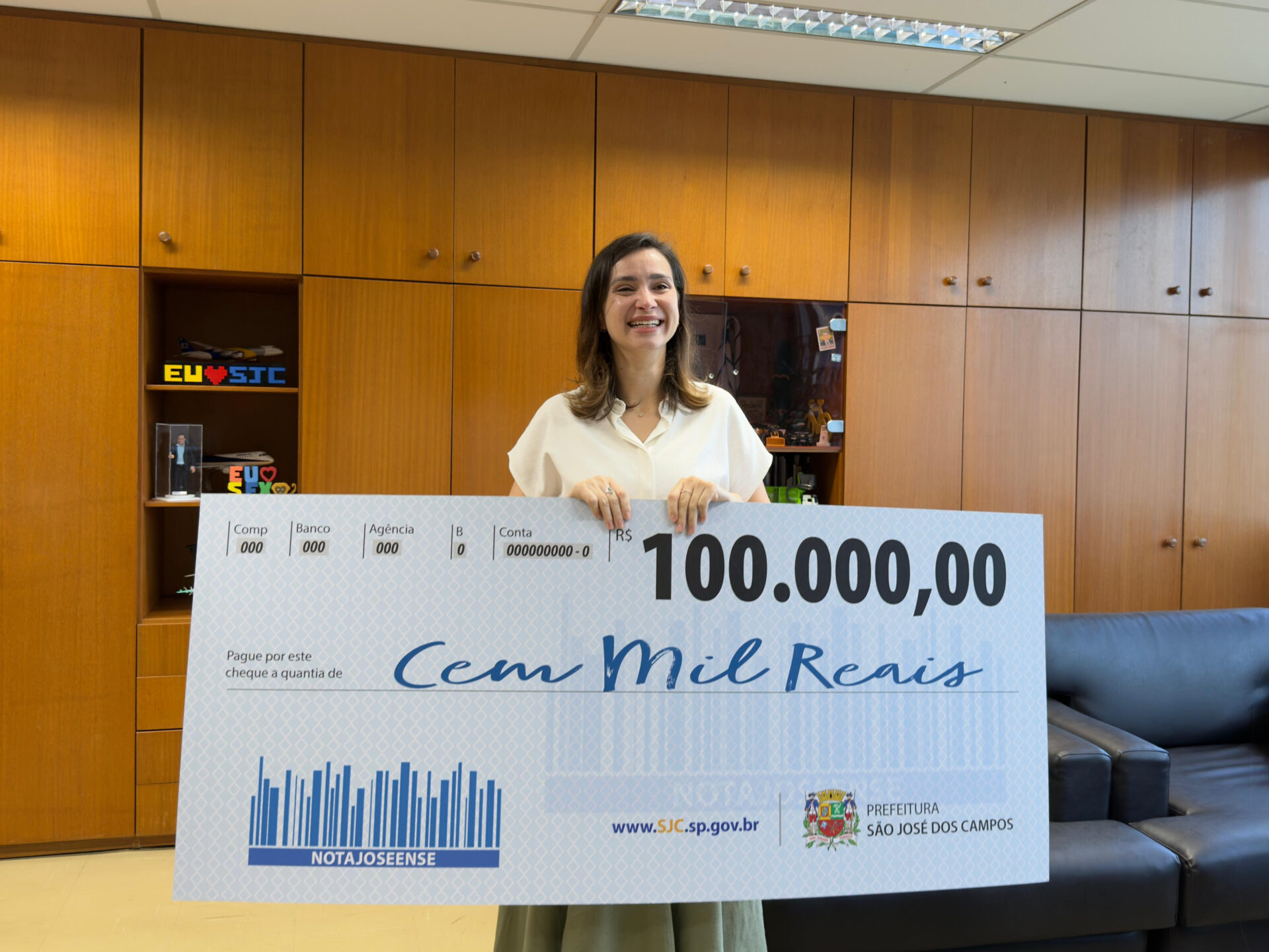 Dayse ficou muito feliz com o prêmio que ganhou da Prefeitura e vai usar o dinheiro para comprar um carro para o dia a dia – Foto: PMSJC.