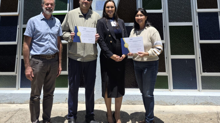 Os diretores médicos Marco Antônio da Silva (esq) e Lin Hung Hua (dir), ao lado do coordenador da UTI, Dr. Rui Neto e da gerente nacional do Epimed, Jucimara da Silva Vieira – Foto: PMSJC.