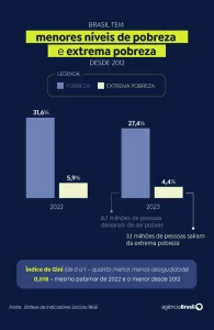 Em relação à pobreza, a proporção da população com o equivalente a menos de US$ 6,85 por dia ficou em 27,4%. O índice era de 34,7% em 2012 e de 31,6% em 2022. Entre 2022 e 2023, 8,7 milhões de pessoas deixaram a ser pobres.