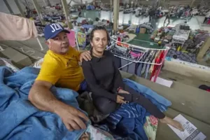 Luiz Antônio Ceccon e sua esposa abrigados no Ginásio Elyseu Quinhones, em Eldorado do Sul (RS) em junho de 2024 – Bruno Peres/Agência Brasil.