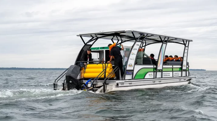 A embarcação também conta com sistema para aproveitar energia solar e, durante a navegação, não emite barulho nem poluentes. O único resíduo do motor é água pura.