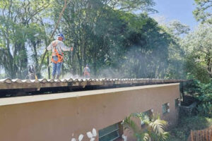 Trabalhadores fazem a limpeza do telhado da Residência. Foto: Paullo Amarall / FCCR.