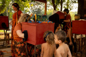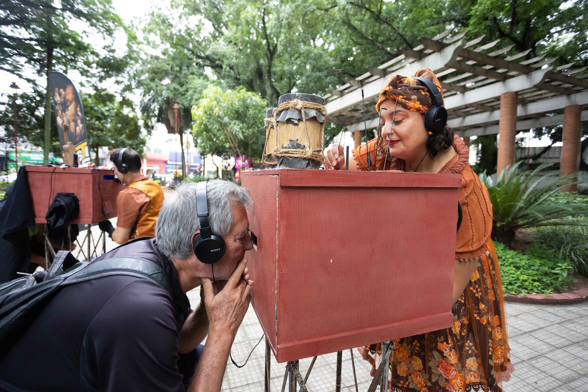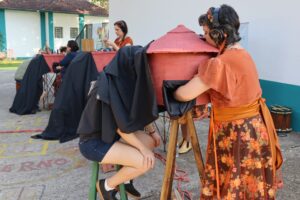 Apresentação do espetáculo “Pequenos Mestres” – apresentação de teatro lambe-lambe que traz caixas com histórias em miniaturas que homenageiam mestres e mestras da cultura e dos saberes tradicionais do Vale do Paraíba.