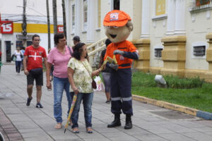 Zé Garoa distribuindo cartilhas com orientações à população | Foto: Charles Moura/PMSJC.