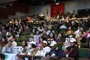 Platéia com cartazes na plenária do Plano Clima Participativo, em agosto, com o tema Mata Atlântica, no Sesc Vila Mariana. Foto: Rovena Rosa/Agência Brasil.