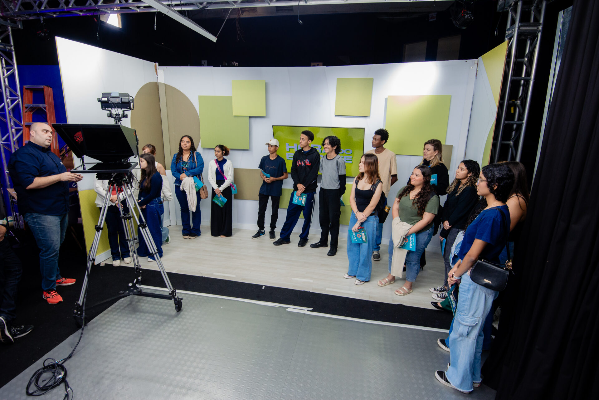 LEGENDA: Estudantes conheceram o estúdio da TV Câmara, onde os apresentadores tinham encerrado o programa Hora do Esporte.