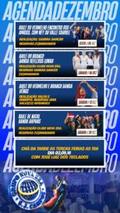 “A️ Agenda de Dezembro do Clube Nova Era e dos nossos parceiros, está recheada para dançarmos juntos. Reúna a sua Família e amigos e venham curtir com a gente. Aproveite e compartilhe a nossa agenda”. Sônia Maria Reis, diretora presidente do Grupo Nova Era.