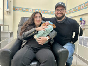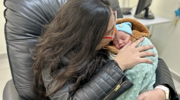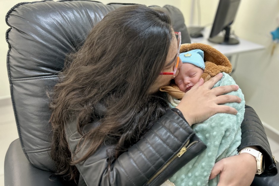 Com lágrimas nos olhos ao compartilhar sua jornada, Vanessa segura o pequeno Theodoro em seus braços | Foto: PMSJC.