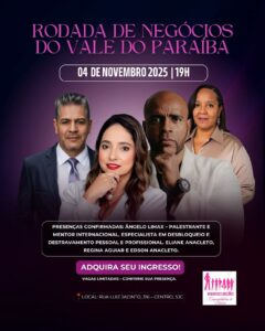 Uma rodada imperdível com grandes empresários do Vale do Paraíba, marcada por networking, conexões e muito aprendizado, no dia 04 de novembro de 2025, às 19 horas, na Rua Luiz Jacinto, 316, Centro, São José dos Campos – SP.