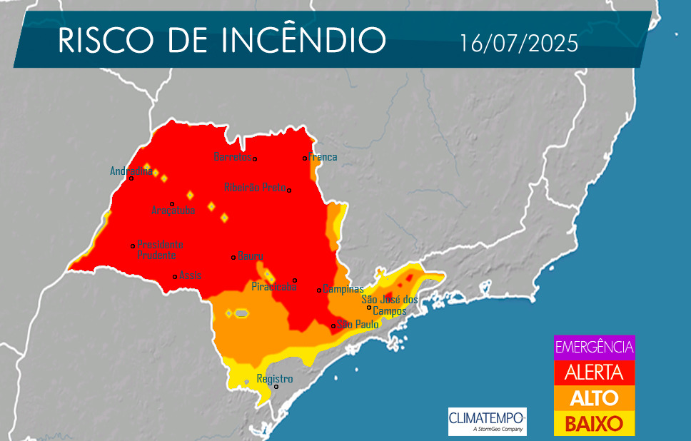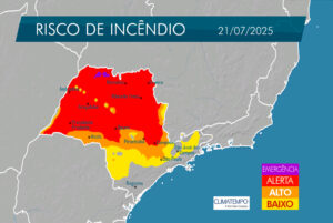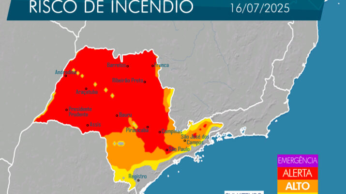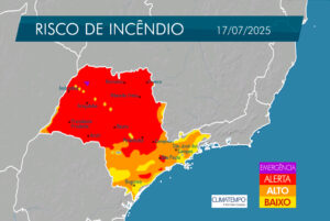 Nos próximos dias, quase todo o estado de São Paulo estará em estado de atenção para incêndios. O risco é elevado principalmente na quinta (17) e na sexta-feira (18), quando a baixa umidade relativa do ar, as temperaturas elevadas e o predomínio do Sol intensificam as chances de queimadas em todas as regiões paulistas.