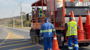 O serviço de manutenção é completo, abrangendo tanto a sinalização horizontal, como faixas de eixos, quanto a vertical, com a instalação de placas.